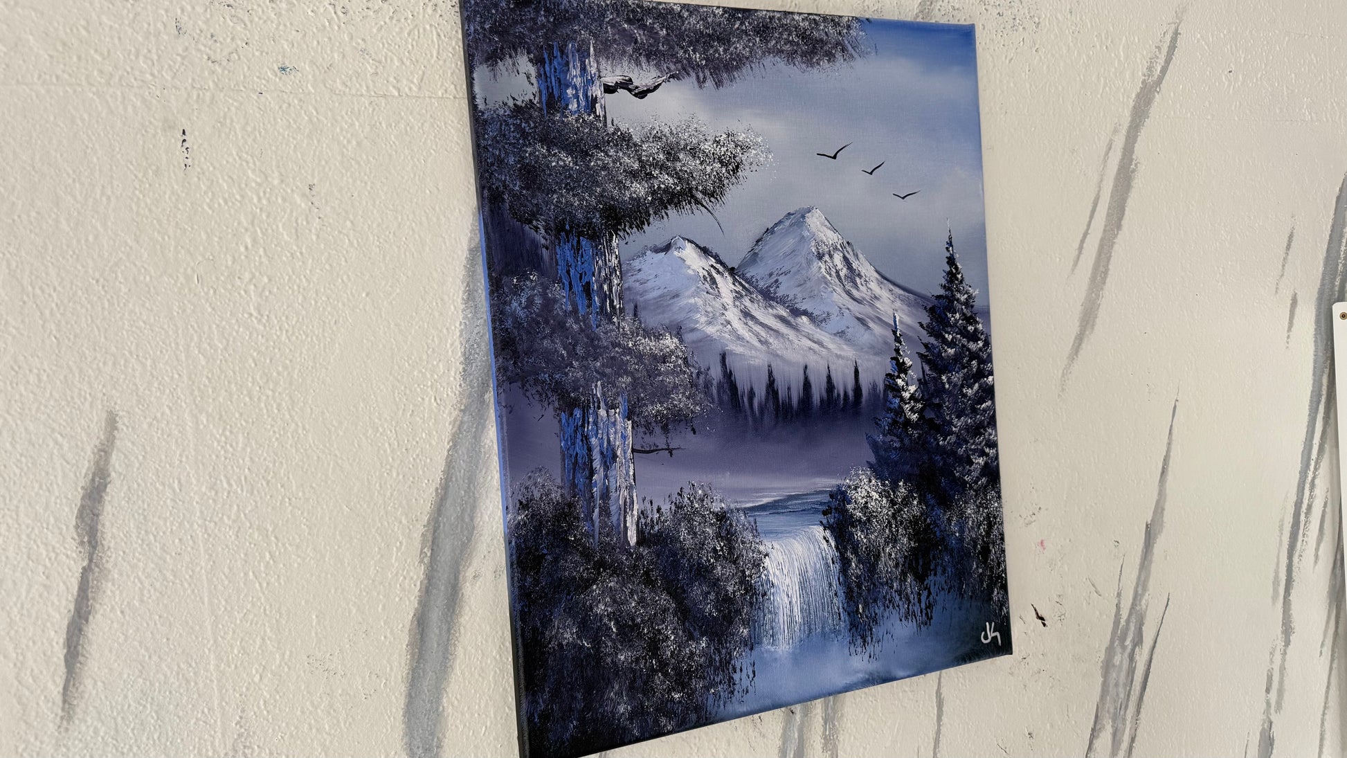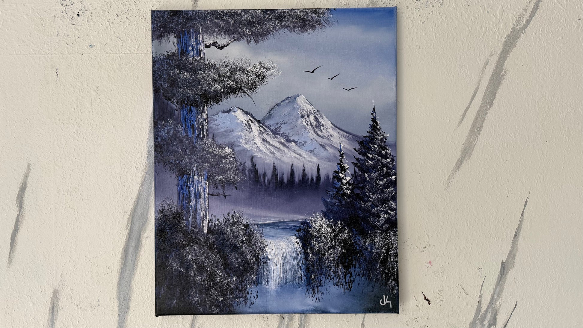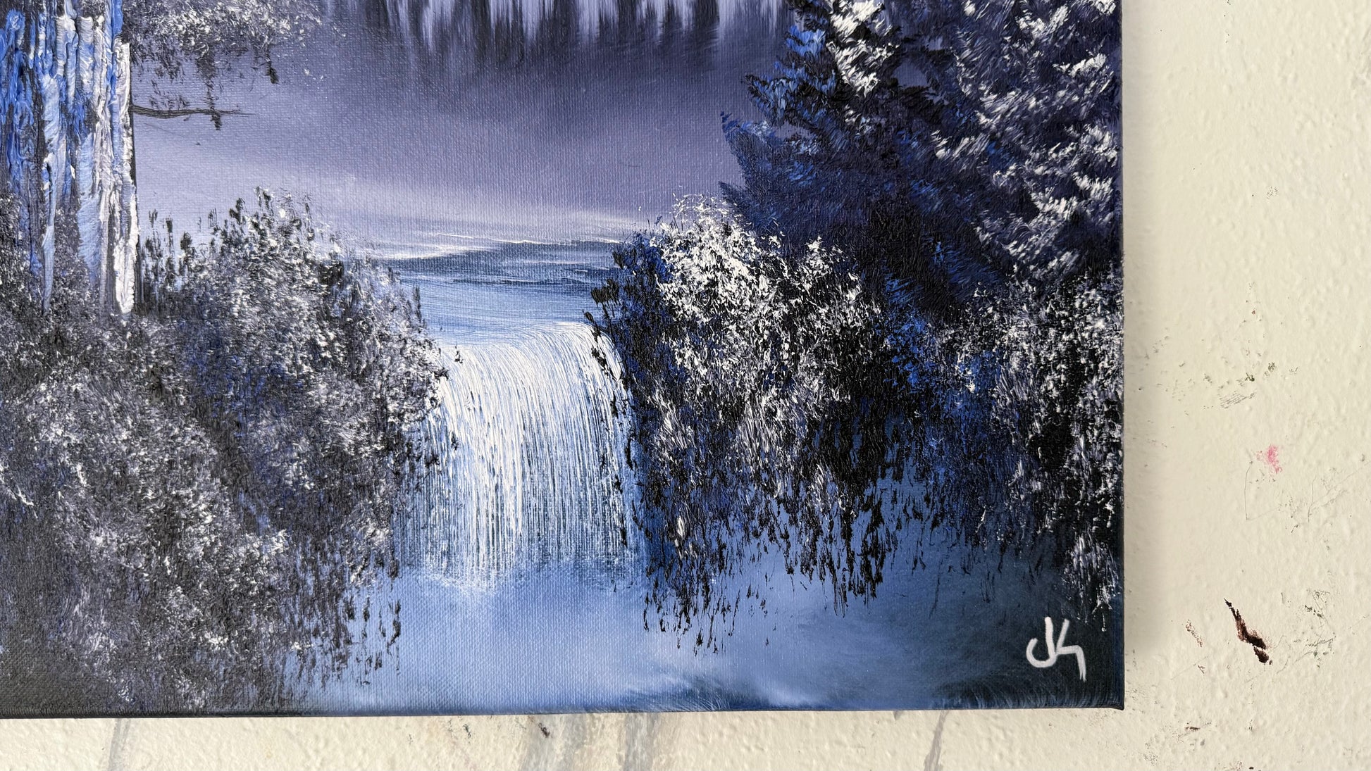 Painting #1997 - 16x20" Canvas - Winter Forest Waterfall Landscape painted 8-15-25