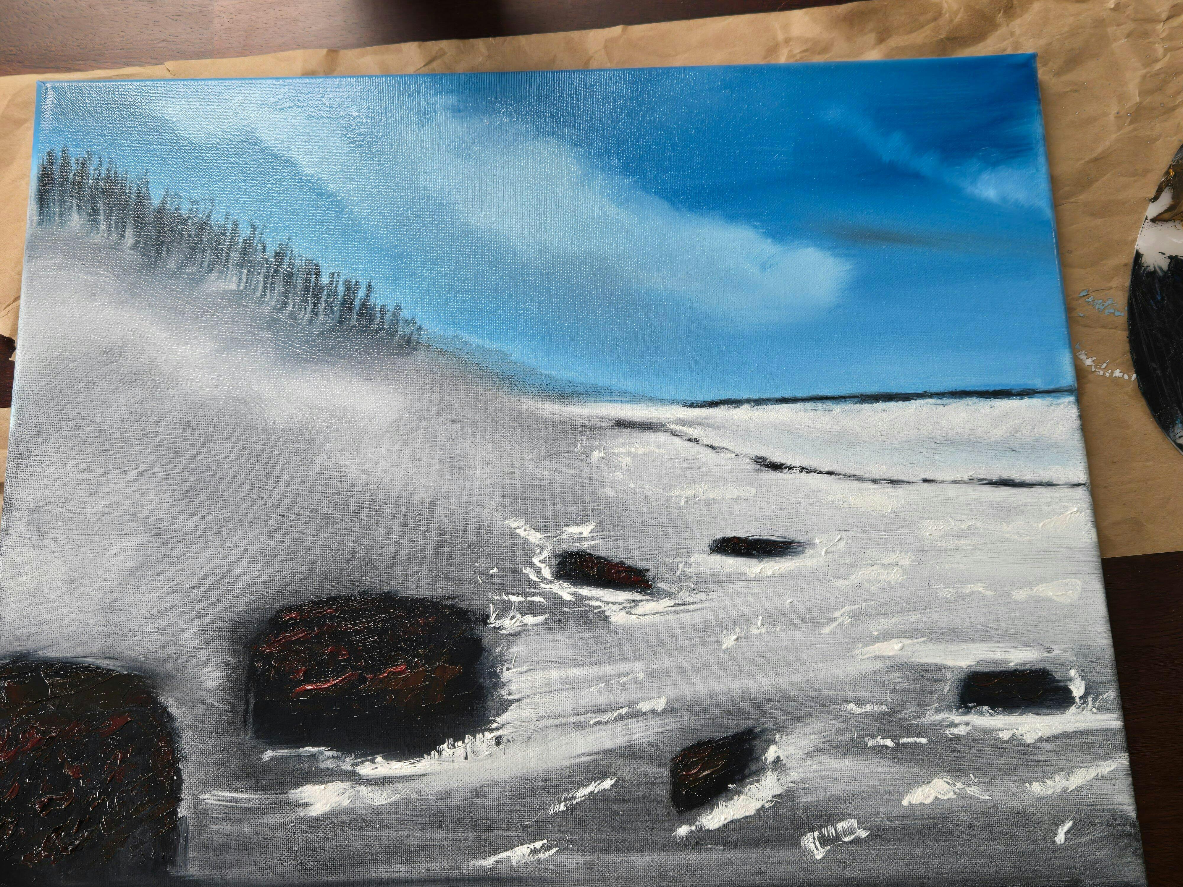 You'll need a 16x20" (or larger) black canvas. We'll be using Liquid Clear and Liquid White as the base coat along with a few colors listed below. We'll also be using liquid White for highlights. You'll need to Black Gesso the bottom half of the canvas and make a mountain shape on the left prior to class so it's dry. We will wet the canvas together as a group and then paint the Seascape scene pictured above.