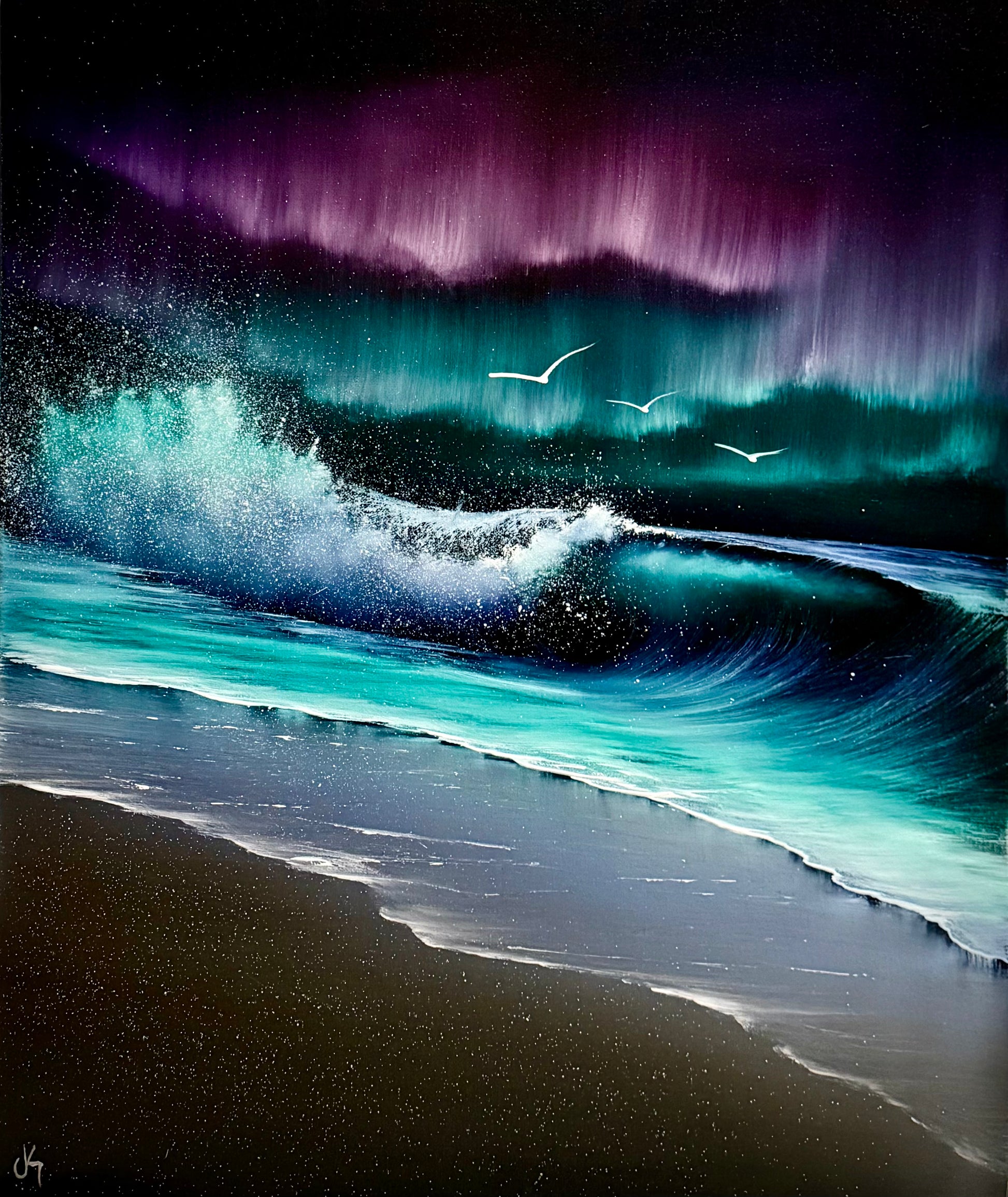 Painting #2158 - 20x24" Canvas - Northern Lights Seascape painted 11-22-25