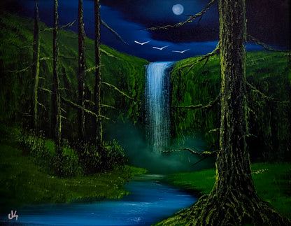 Painting #1772 - 16x20" Canvas - Night Canyon Waterfall painted 3-31-25