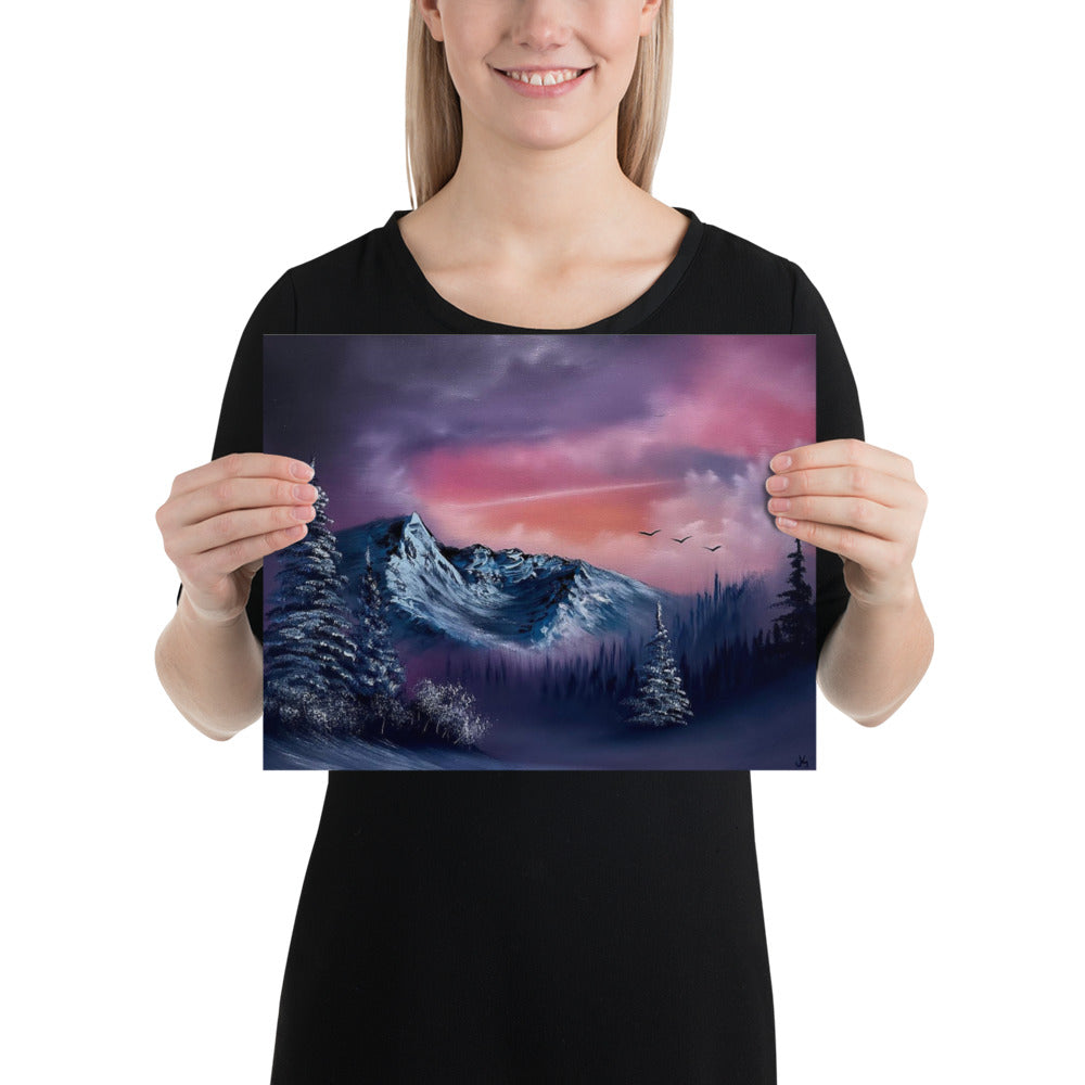 Poster Print - Sunset Winter Landscape for Karen (Mum) With Mountains & Evergreens by PaintWithJosh - Paint With Josh
